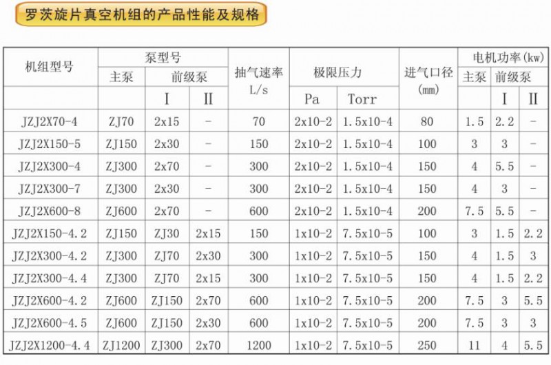 羅茨旋片真空機組的產(chǎn)品介紹JSJ2X型羅茨旋片真空機組是以羅茨泵為主泵,以旋片泵為前泵串聯(lián)而成。其結(jié)構(gòu)緊湊,操作方便。使用于除空氣及其它無可凝性及無腐蝕性氣體,廣泛應用于需要大抽速和高真空的各種真空系統(tǒng)中。如:真空冶煉電力電容器、變壓器、真空浸漬處理、真空鍍膜設備中的預抽等。