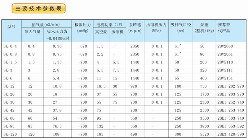 SK系列水環式真空泵及壓縮機被廣泛應用于機械、石油化工、制藥、食品、制糖工業及電子領域。由于在工作過程中氣體的壓縮過程是等溫的,所以在壓縮和抽吸易爆炸氣體時,不易發生危險,所以其應用更加廣泛。作為80年代的水環真空泵技術,SK系列水環泵目前雖仍有用戶在使用,但因其效率低,性能差,將逐漸被2BV、2BE1 系列節能水環泵所取代。